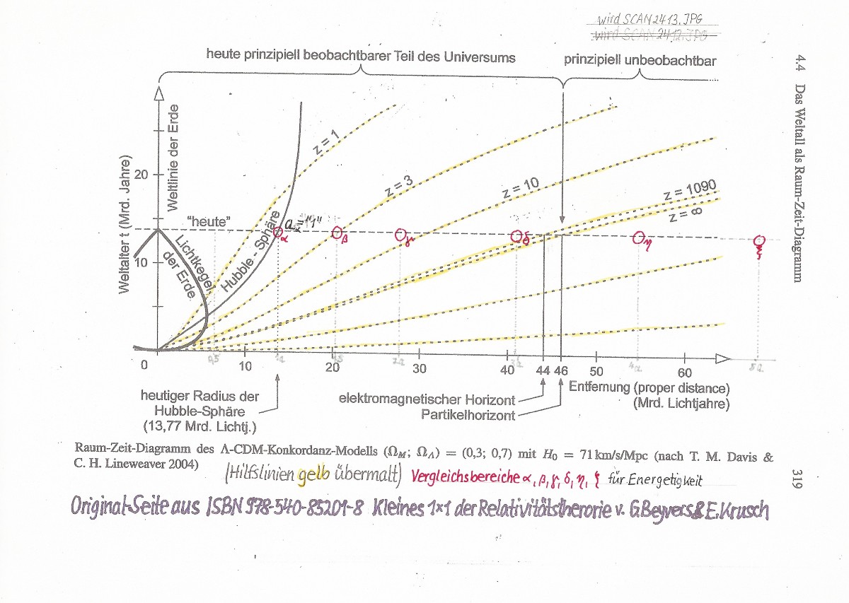 Hier auf der 9ten Seite geht es mir zunächst darum, die Zeitumkehr, also die reziproke Verwendung der "ÜberlichtgeschwindigkeitsErscheinung" infolge der Hubble′schen Expansion bei den "z"-Werten über "1" „vernünftig“ zu quantifizieren. Dann geht es mir als Zweites darum die 96% {FantomEnergie &-Materie} gegenüber 4% leuchtender Materie als „verkehrte“ Bilanzierung der Energetig/Enerketig-keiten aufzuklären.